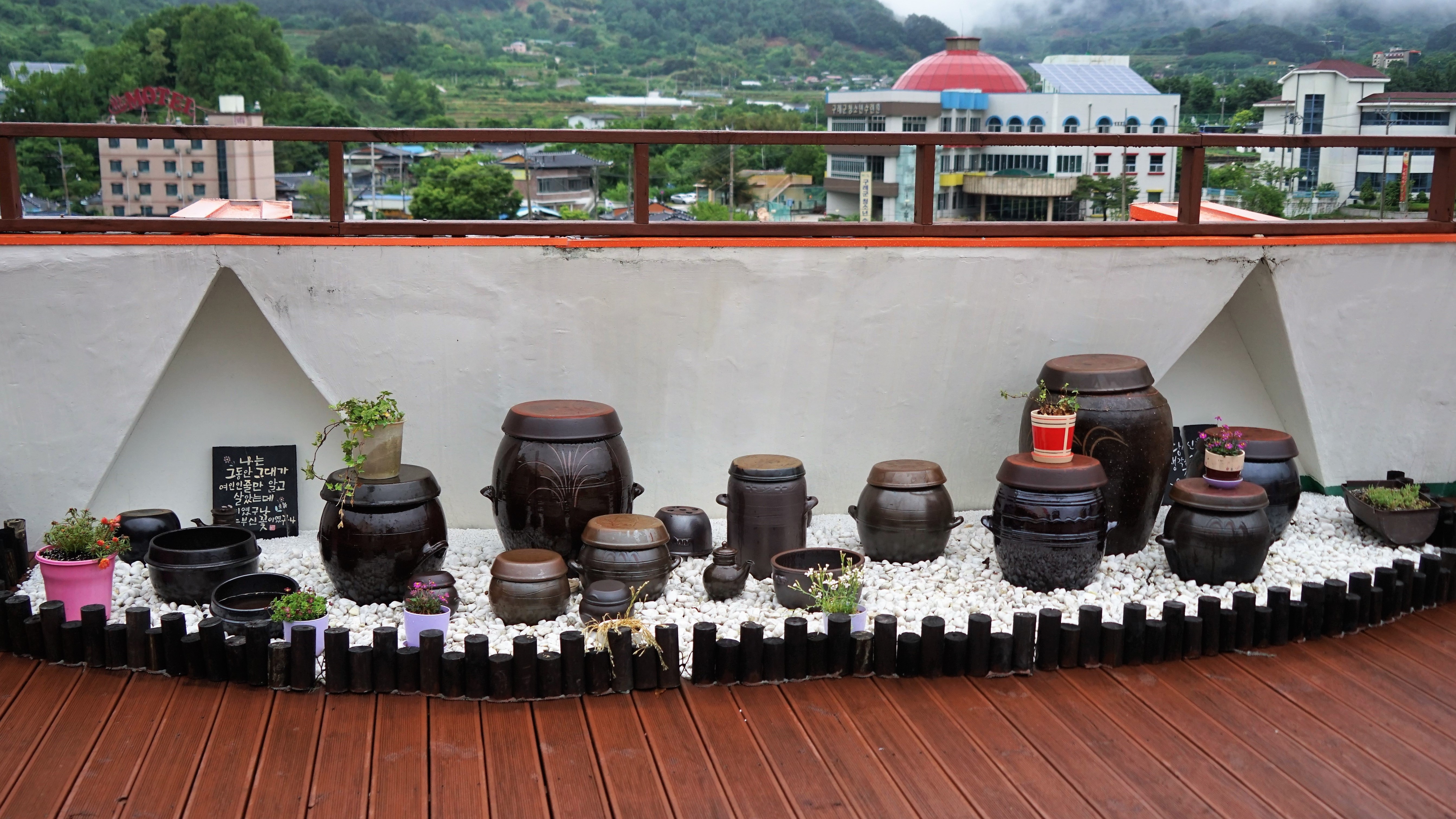 숙소의 옥상에 꾸며진 앙증맞은 장독대가 이쁘기도 하다.