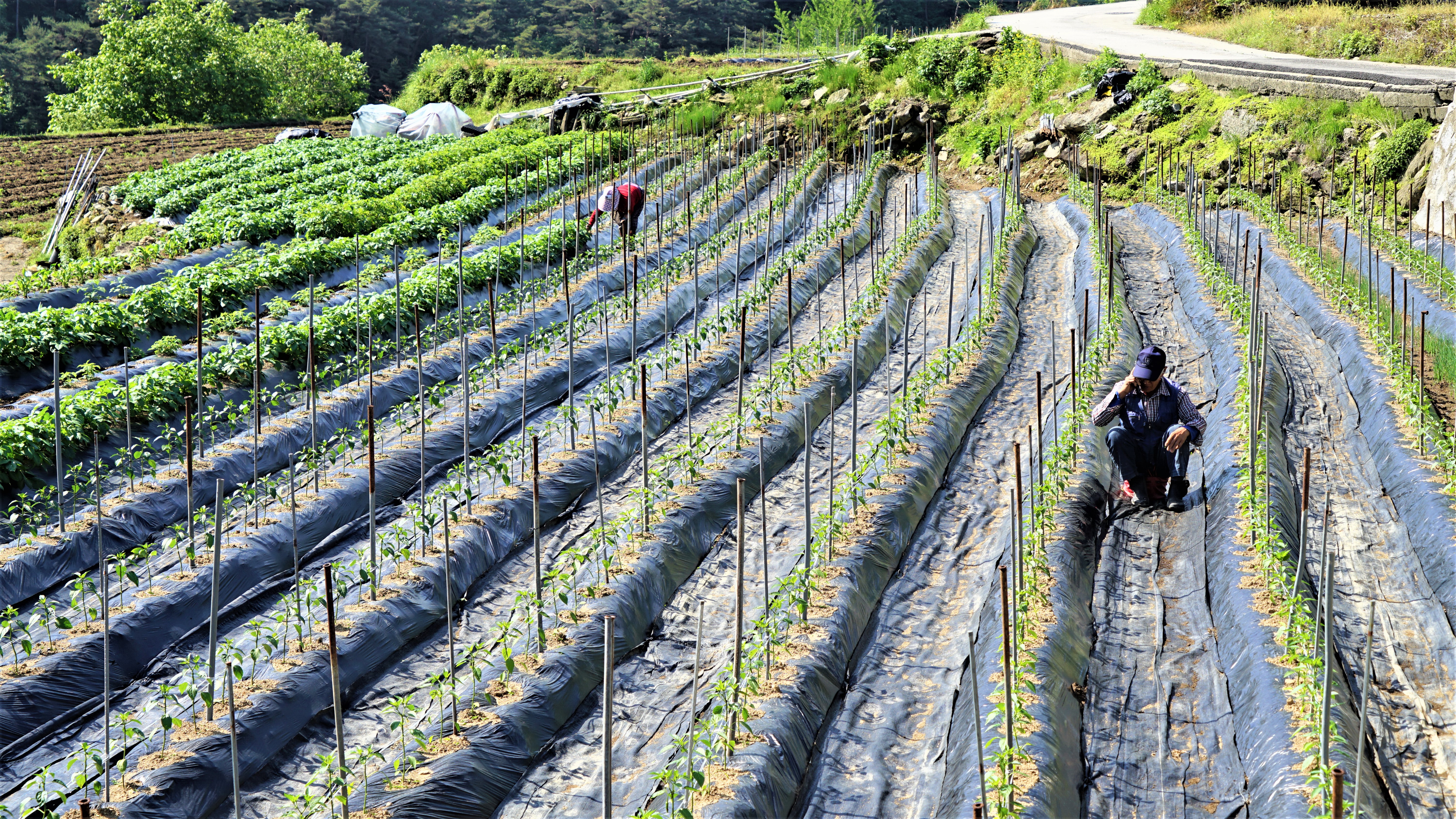 고추모종을 마치고 지줏대를 세워 묶어주고있는 부부농부의 땀흘리는 모습.