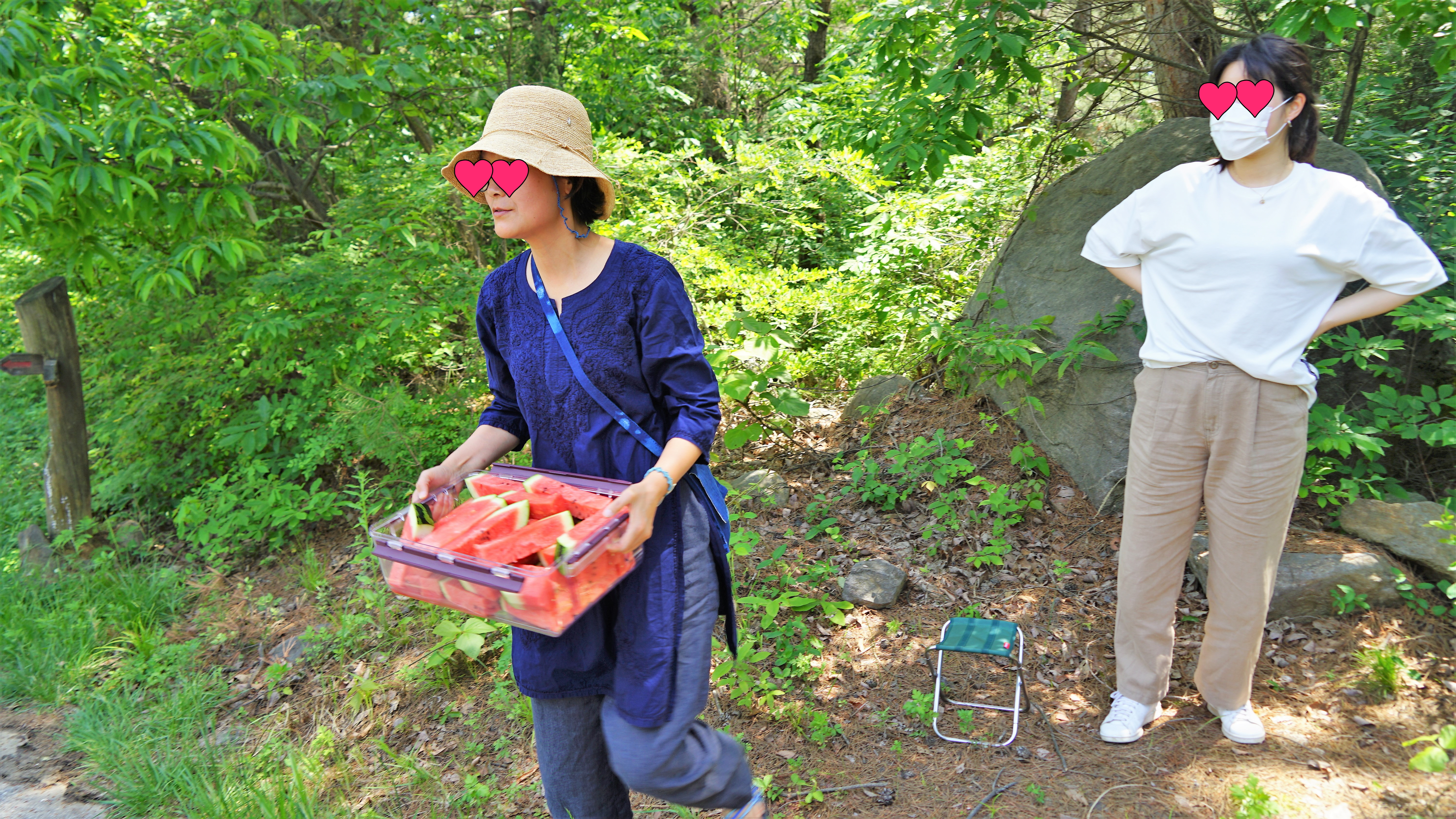 선녀의 모녀가 시원하고 맛있는 수박선물을 안고 짜잔하고 등장하누나.
