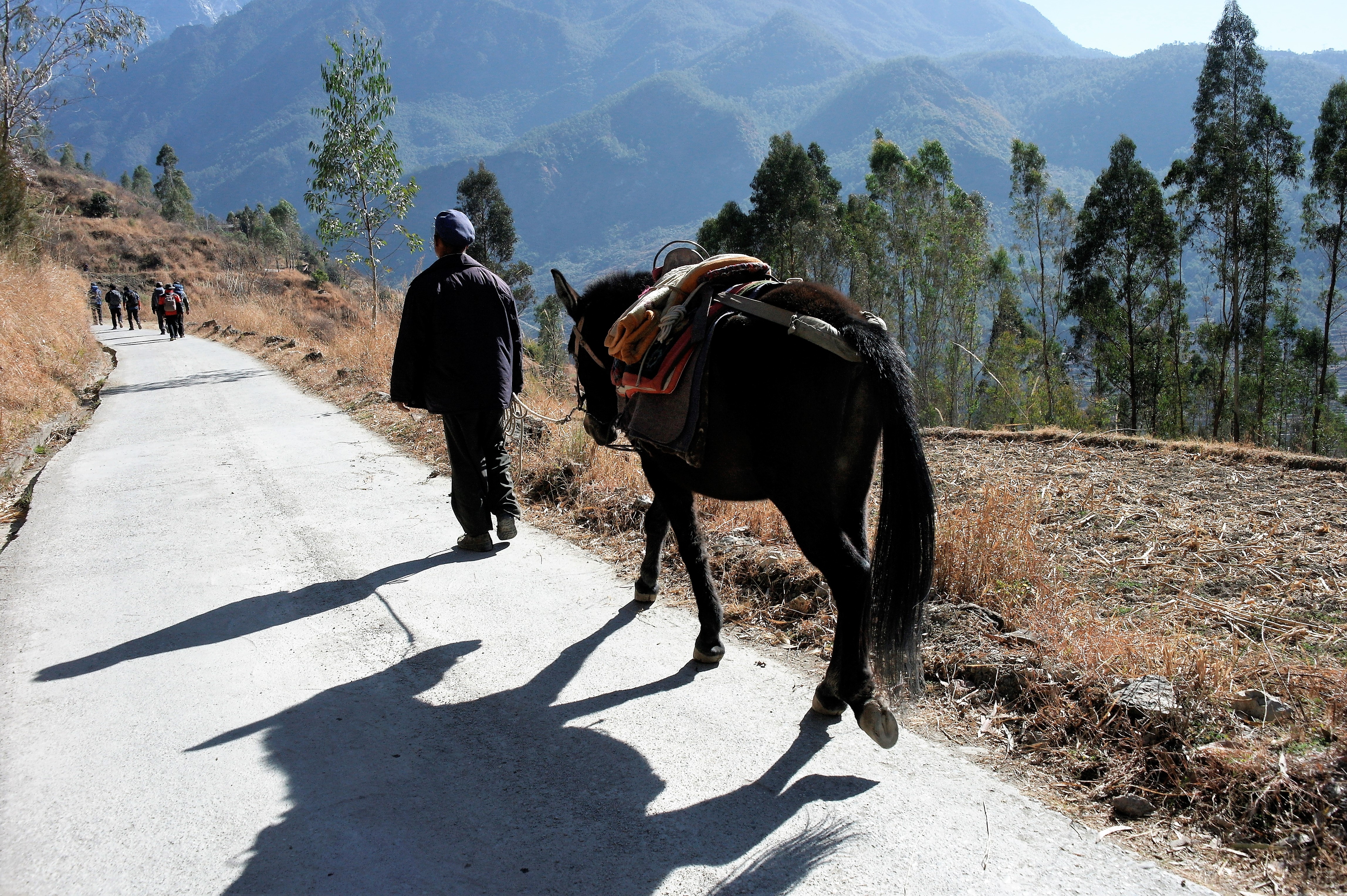 길동무 뒤를 따르며 현지인의 마부가 말을 끌고 유혹한다.